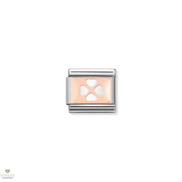 Eredeti összetett láncszem a Nomination összetett klasszikus karkötőjéhez, négylevelű lóhere (shamrock) lemezzel, 9 karátos rózsaszín aranyból, rozsdamentes acélon. Olaszországban gyártva.