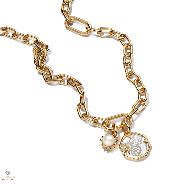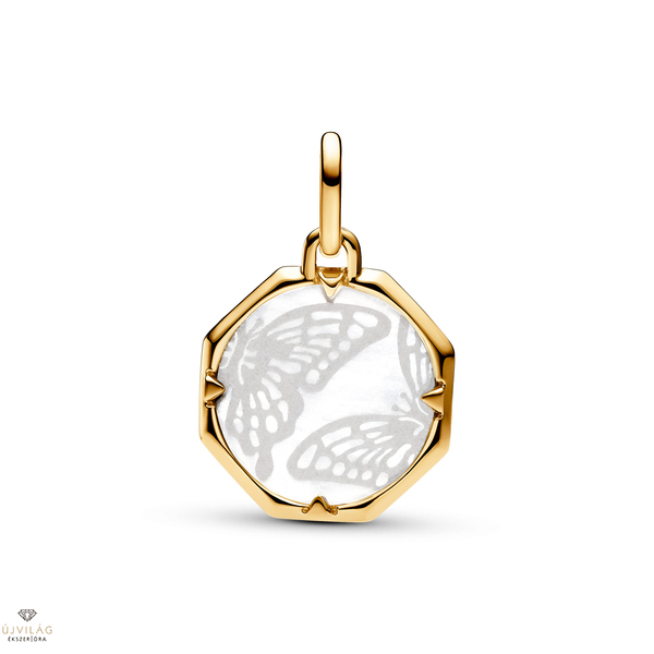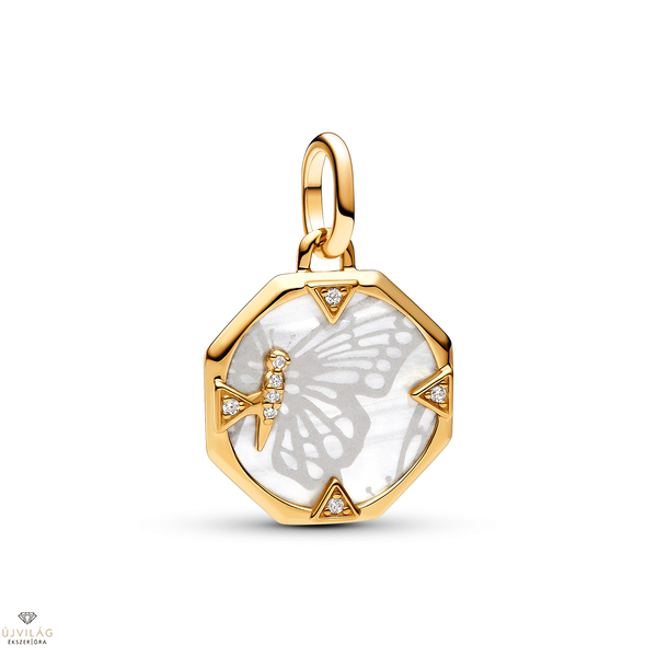 Viselje az izgalom szimbólumát a Pandora ME gyöngyházfényű pillangó medál charmmal. A fehér biogyanta mesterséges gyöngyházból készült, lézergravírozott pillangó sziluettekkel díszített középső korongot 14 karátos arannyal futtatott nyolcszög alakú medál foglalja keretbe. A nyolcszög alakú keretet háromszög alakú, átfedő elemek díszítik, amelyek egyik oldalán szikrázó kövek találhatók, és amelyek közül az egyik egy pillangó testét alkotó kövek sorának része. Válassza ezt a pillangó charmot, hogy emlékeztesse az új élmények befogadására. Csak nyitható láncszemeken viselhető.