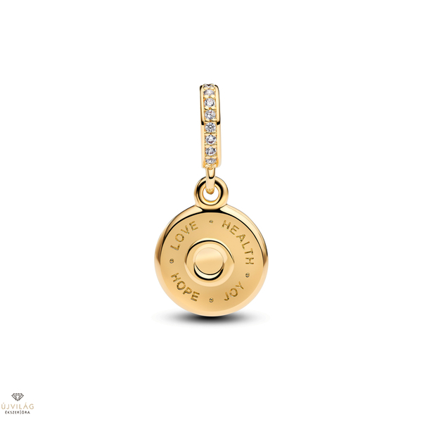 Teremts extra születésnapi hangulatot a Születésnapi torta függő charmmal! A 14 karátos arannyal futtatott vidám charm elülső oldalán egy „Happy Bday” gravírozással díszített születésnapi torta látható, amelyet szikrázó kövek vesznek körül. A charm másik oldalán a tortaállvány, valamint tortaszeletek és egy villacsont látható. A hátoldalt ezek mellett a „MAKE A wish”, a „LOVE”, a „HEALTH”, a „HOPE” és a „JOY” gravírozások díszítik. Kedves meglepetés bárki születésnapjára. Méretek: Mélység: 5,2 mm. Magasság: 10,8 mm. Szélesség: 10,8 mm.