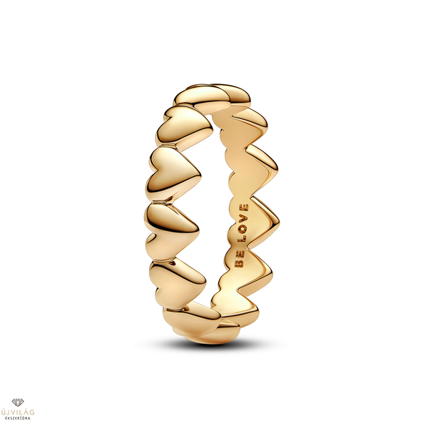 Legyen az ajándékod szívből jövő ezzel a 14 karátos arannyal futtatott gyűrűvel. A mesterien megmunkált, szívecskék sora alkotta gyűrűsínnel rendelkező, romantikus hangulatot árasztó gyűrű önmagában vagy kontrasztos Pandora gyűrűkkel kombinálva is gyönyörűen mutat. Add ajándékba, hogy jelentéssel teli módon fejezdhesd ki szeretetedet, vagy lepd meg magad egy olyan darabbal, amelyet mindig szívesen viselsz majd. Méretek: Mélység: 2 mm; Magasság: 4,5 mm.