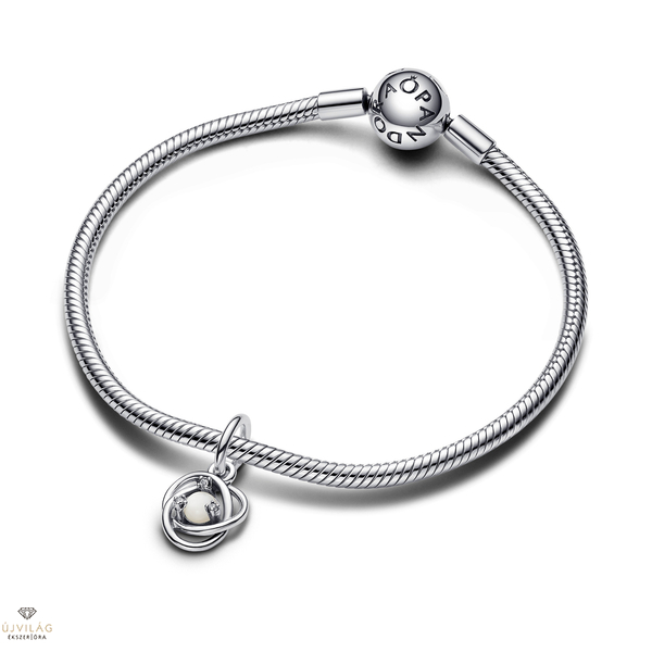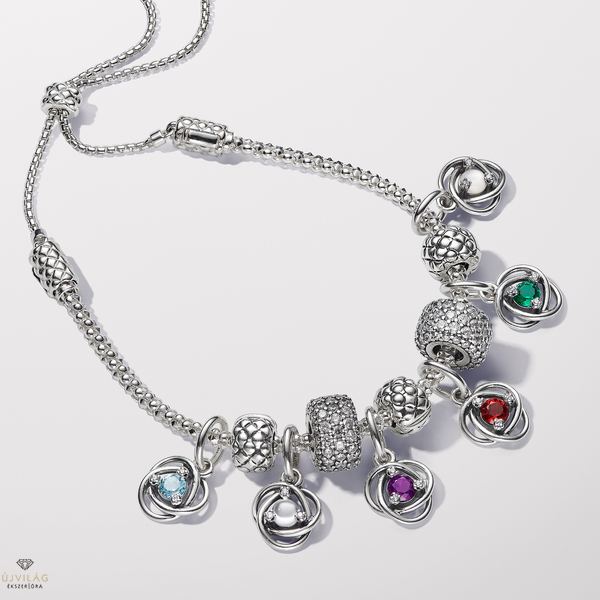 A bonyolult formát követő Fehér örökkévalóság kör függő charm Pandora Moments kollekciód kötelező darabja. A csillogó sterling ezüstből készült, áttört végtelen fonatot egy a középpontban elhelyezkedő nagyobb fehér, cabochon csiszolású biogyanta mesterséges gyöngyház kő díszíti, amelyet három, elegáns hatást keltő, áttetsző cirkónia vesz körül. A bonyolult minta az örökkévalóságot szimbolizálja, további jelentést kölcsönözve az ékszernek. Dobd fel karkötődet ezzel az időtlen darabbal, vagy add ajándékba az örök kötelék szimbólumaként. - A megfelelő Pandora charm karkötő méret kiválasztása: csuklóját szorosan mérje meg mérőszalaggal, majd a kapott értékhez adjon hozzá 2-2,5 cm-t. Példa: 17 cm-es csuklóméret esetén 19 cm-es Pandora charm karkötőt javaslunk.