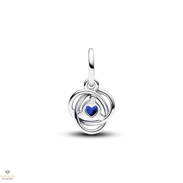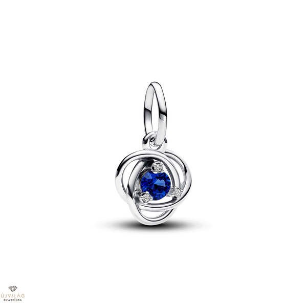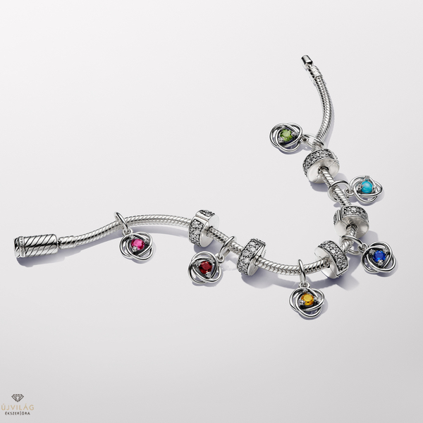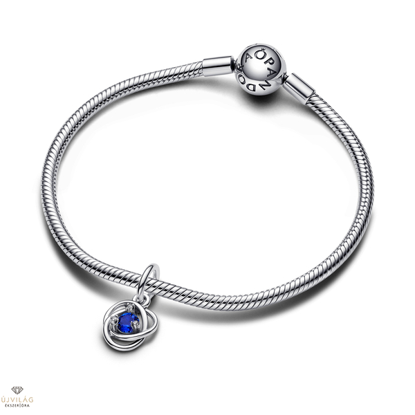 A bonyolult formát követő kék örökkévalóság köre függő charm a Pandora Moments kollekció kötelező darabja. A csillogó sterling ezüstből készült, áttört végtelen fonatot középen egy kék mesterséges kristály díszíti, amelyet három, elegáns hatást keltő, áttetsző cirkónia vesz körül. A bonyolult minta az örökkévalóságot szimbolizálja, további jelentést kölcsönözve az ékszernek. Dobja fel karkötőjét ezzel az alapdarabbal, vagy adja ajándékba az örök kötelék jelképeként.