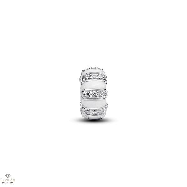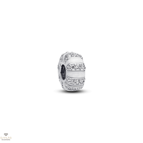 A megjelenésed ragyogni fog a hűvös tónusú Kövek és tűzzománc klip charmmal! A sterling ezüst charm jellegzetességei a szikrázó kövek és a csillámló fehér tűzzománc alkotta váltakozó sorok, melyek érdekes kontrasztot képeznek a charm alapjával, amelynek belső, klip része szilikonbetétet tartalmaz. A charm dizájnját az alkalmazkodóképesség és a szépség motívumai ihlették – amelyek a benned rejlő számtalan lehetőséget szimbolizálják, akárcsak egy apró, mégis elegáns és gondosan megmunkált ékszerben rejlő lehetőségeket. Méretek: Mélység: 9,2 mm. Magasság: 9,2 mm. Szélesség: 4,7 mm.