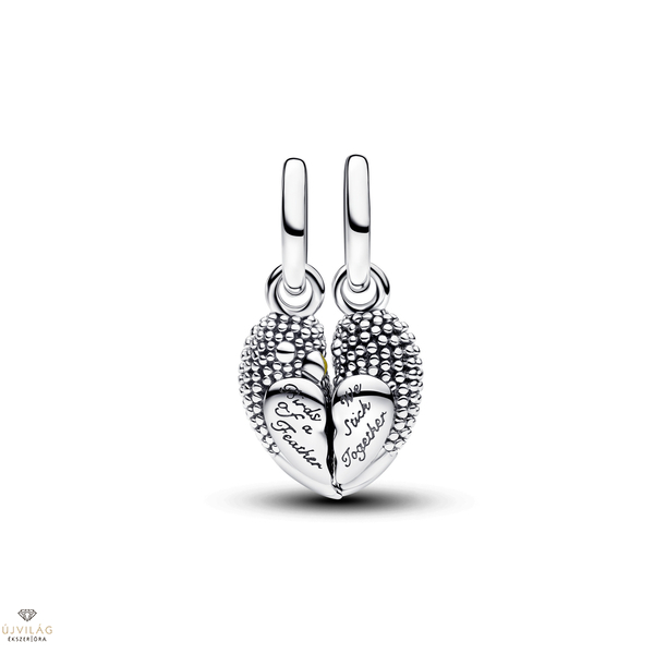Ossza meg a szeretetet a két részre választható medálunkkal! A színes zománccal díszített, sterling ezüstből készült függő medálok mindegyike egy-egy mély értelmű felirattal van ellátva: az egyiken „Birds of a feather” (A madarak tollazata), a másikon pedig „We stick together” (Együtt maradunk) felirat olvasható. Méretek: 5,25 mm mély, 11,3 mm magas, 10,5 mm széles.