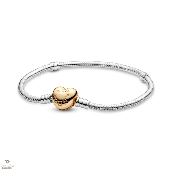 Sterling ezüst kígyólánc 14 karátos arannyal futtatott szív alakú zárral. Méretek: Mélység: 11 mm, Magasság: 11 mm, Szélesség: 12 mm. - A megfelelő Pandora charm karkötő méret kiválasztása: csuklóját szorosan mérje meg mérőszalaggal, majd a kapott értékhez adjon hozzá 2-2,5 cm-t. Példa: 17 cm-es csuklóméret esetén 19 cm-es Pandora charm karkötőt javaslunk.