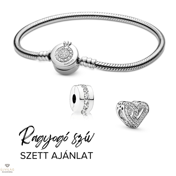 A Pandora Ragyogó szív szett tartalma: 1db 20 cm-es ezüst karkötő (599046C01-20), 1db klip (791972CZ) és 1db szív charm (798692C01) . A felsorolt termékek nem módosíthatók, a szett csak ebben a formában érhető el kedvezményesen, visszavonásig, ill. a készlet erejéig. Ajándékfutár szolgáltatással igénybe vehető. Más ajánlattal, akcióval, ajándékkal, kedvezménnyel, kuponkóddal nem vonható össze. - A megfelelő Pandora charm karkötő méret kiválasztása: csuklóját szorosan mérje meg mérőszalaggal, majd a kapott értékhez adjon hozzá 2-2,5 cm-t. Példa: 17 cm-es csuklóméret esetén 19 cm-es Pandora charm karkötőt javaslunk.