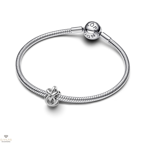 Add hozzá az örökkévalóság egyik szimbólumát a kollekciódhoz a Végtelen csomó charmmal! A sterling ezüstből készült charm egy végtelen alakú csomót formál, amely a kötődést, az alkalmazkodóképességet és az élet viszontagságainak ellenálló erőt jelképezi. Amellett, hogy háromdimenziós hatást kölcsönöz minden megjelenés számára, ez a charm arra a határtalan tulajdonságunkra emlékeztet minket, hogy képesek vagyunk bármilyen kihíváshoz alkalmazkodni és újból talpra állni – olyan erősen, mint egy végtelen csomó. Méretek: Mélység: 13,3 mm. Magasság: 12,5 mm. Szélesség: 7,7 mm.