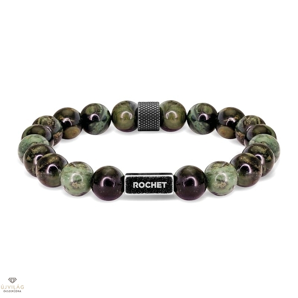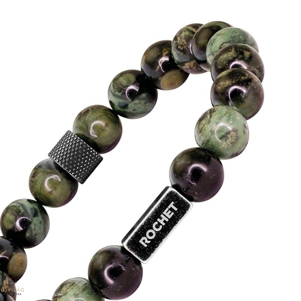 Klasszikus és divatos egyszerre – francia acél ékszerek minőségi kidolgozással. Ásványi kőzet karkötő 8 mm-es, zöld alapon sötét mintázatú kambaba jáspis gömbökkel elasztikus fűzőfonálon, antikolt hatású fekete színű acél márkajelzéssel. A karkötő átmérője kb. 9,5 cm, mely rugalmassága révén 18-21 cm-es csuklóméretre megfelelő.