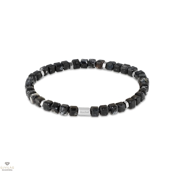 Klasszikus és divatos egyszerre – francia acél ékszerek minőségi kidolgozással. Ásványi kőzet karkötő szögletesre csiszolt 5,5 mm-es szürke színű hópehely obszidián szemekkel elasztikus fűzőfonálon, nyolc darab ezüst színű, hatszögletű acél kiegészítéssel a szemek között. A karkötő átmérője kb. 9,5 cm, mely rugalmassága révén 18-21 cm-es csuklóméretre megfelelő. A hatszögek átmérője 5 mm.
