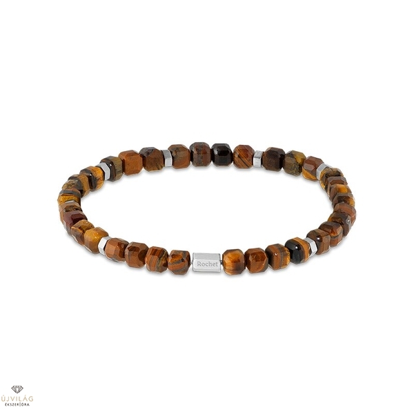 Klasszikus és divatos egyszerre – francia acél ékszerek minőségi kidolgozással. Ásványi kőzet karkötő szögletesre csiszolt 5,5 mm-es barna színű tigrisszem szemekkel elasztikus fűzőfonálon, nyolc darab ezüst színű, hatszögletű acél kiegészítéssel a szemek között. A karkötő átmérője kb. 9,5 cm, mely rugalmassága révén 18-21 cm-es csuklóméretre megfelelő. A hatszögek átmérője 5 mm.