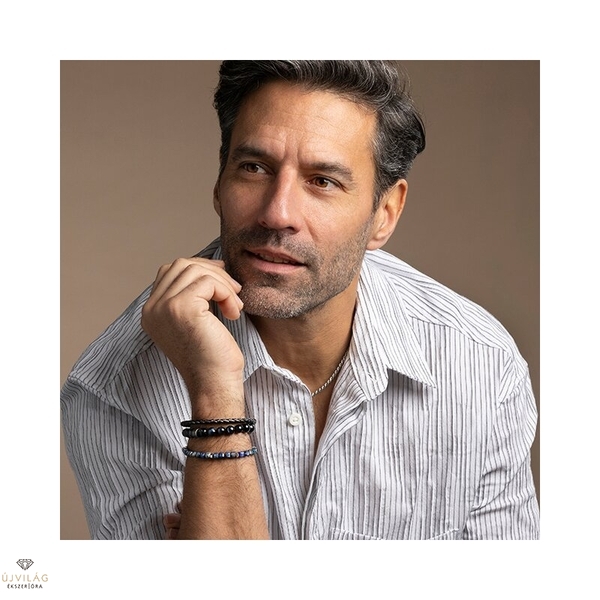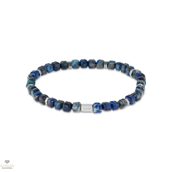 Klasszikus és divatos egyszerre – francia acél ékszerek minőségi kidolgozással. Ásványi kőzet karkötő szögletesre csiszolt 5,5 mm-es kék színű lazurit szemekkel elasztikus fűzőfonálon, nyolc darab ezüst színű, hatszögletű acél kiegészítéssel a szemek között. A karkötő átmérője kb. 9,5 cm, mely rugalmassága révén 18-21 cm-es csuklóméretre megfelelő. A hatszögek átmérője 5 mm.