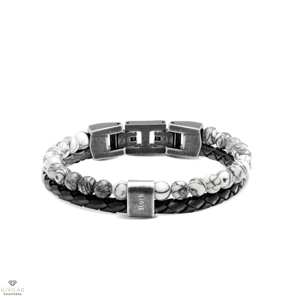 Klasszikus, férfias és divatos egyszerre – francia acél ékszerek minőségi kidolgozással. Fekete fonott bőr és ásványi kőzet karkötő 7 mm-es szürke jáspis gömbökkel. A karkötő hossza 21 cm, szélessége 13 mm. Antikolt hatású fekete színű acél pattintós zárral - melyből egy kb. 1 cm-es zár-rész kivehető, ezzel a karkötő mérete csökkenthető - és gravírozott kiegészítéssel, felirata: Rock.