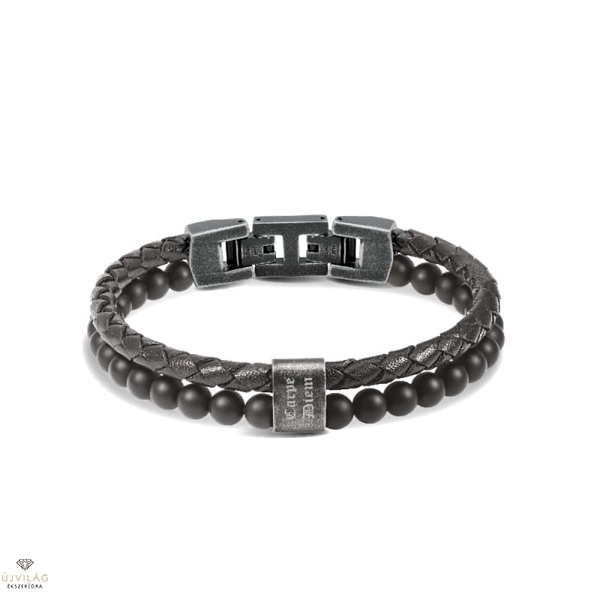 Klasszikus, férfias és divatos egyszerre – francia acél ékszerek minőségi kidolgozással. Fekete fonott bőr és ásványi kőzet karkötő 7 mm-es fekete achát gömbökkel. A karkötő hossza 21 cm, szélessége 13 mm. Antikolt hatású fekete színű acél pattintós zárral - melyből egy kb. 1 cm-es zár-rész kivehető, ezzel a karkötő mérete csökkenthető - és gravírozott kiegészítéssel, felirata: Carpe Diem.
