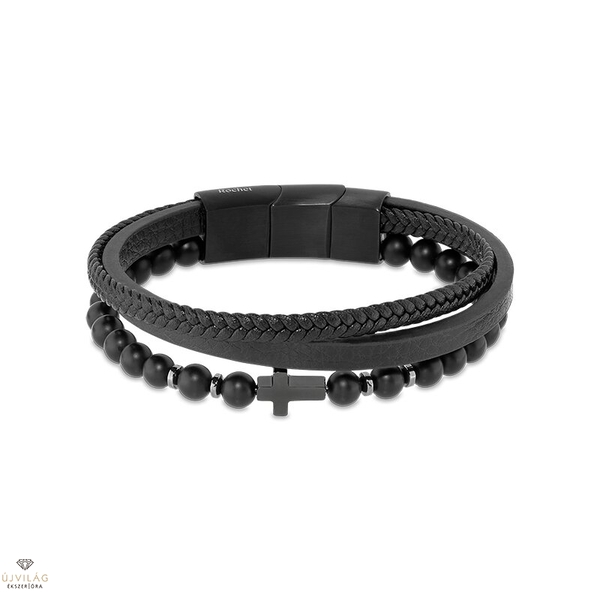 Klasszikus, férfias és divatos egyszerre – francia acél ékszerek minőségi kidolgozással. Többszálú fonott bőr és hasított bőr karkötő ásványi kőzet kiegészítéssel: 6 mm-es fekete achát gömbökkel és fekete színű mágneses zárral. A karkötő hossza 21,5 cm, melyből egy darab kb. 1,5 cm-es zár-rész kivehető, ezzel a karkötő mérete csökkenthető. A bőrszálak szélessége: 5 és 6 mm, anyaga PU bevonatú bőr. A kereszt mérete 12x7 mm. A nemesacél részek fekete színe bevonat, melyet nagy kopásállóságú PVD réteg véd.