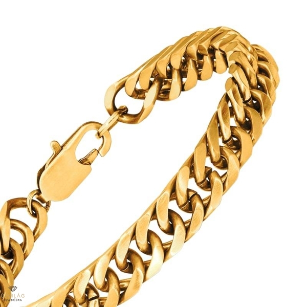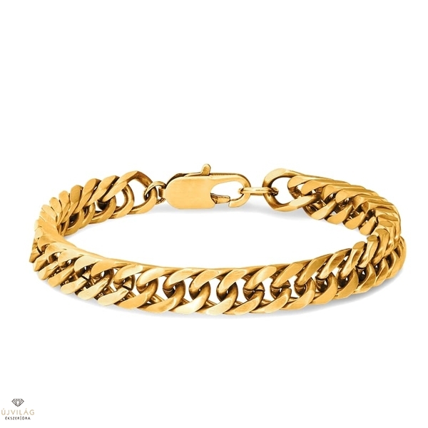 Klasszikus, férfias és divatos egyszerre – francia acél ékszerek minőségi kidolgozással. Sárga arany színű acél karkötő masszív csatszemekkel, karabiner zárral. A karkötő hossza 24 cm, mely a hosszabbító révén kb. 21 cm-ig kisebb méretekre is állítható. A láncszemek szélessége 8 mm. A karkötő sárga színe bevonat, melyet nagy kopásállóságú PVD réteg véd.