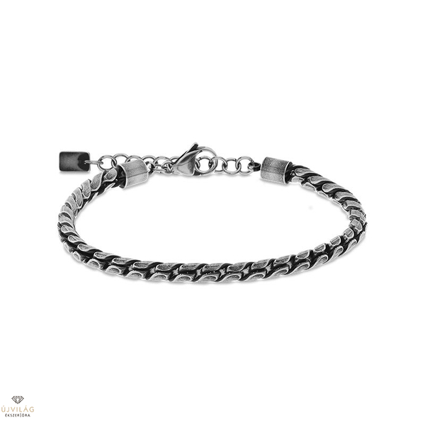 Klasszikus, férfias és divatos egyszerre – francia acél ékszerek minőségi kidolgozással. Szürke színű, antikolt hatású acél karkötő letisztult, egymásba fonódó hengeres formájú csatszemekkel, karabiner zárral. A karkötő hossza 26 cm, mely a hosszabbító révén kb. 21,5 cm-ig kisebb méretekre is állítható. A láncszemek szélessége 5 mm.