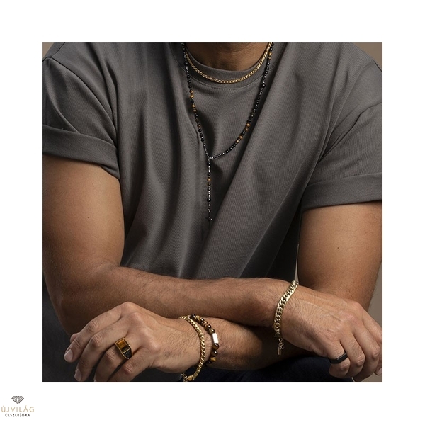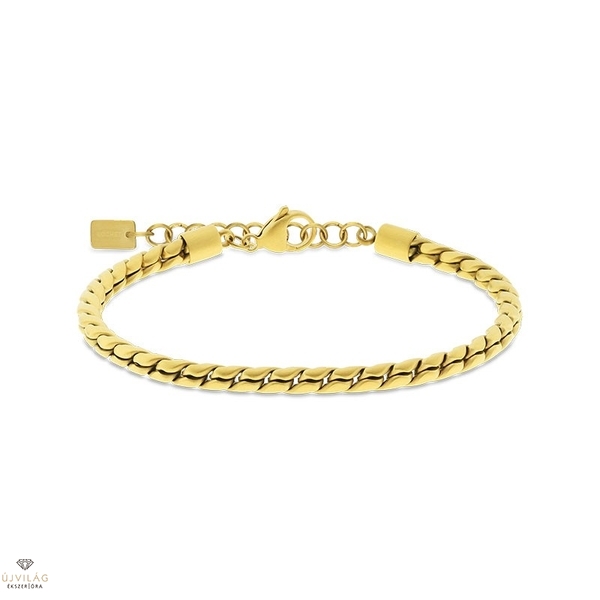 Klasszikus, férfias és divatos egyszerre – francia acél ékszerek minőségi kidolgozással. Sárga arany színű acél karkötő letisztult, egymásba fonódó hengeres formájú csatszemekkel, karabiner zárral. A karkötő hossza 26 cm, mely a hosszabbító révén kb. 21,5 cm-ig kisebb méretekre is állítható. A láncszemek szélessége 5 mm. A karkötő sárga arany színe bevonat, melyet nagy kopásállóságú PVD réteg véd.