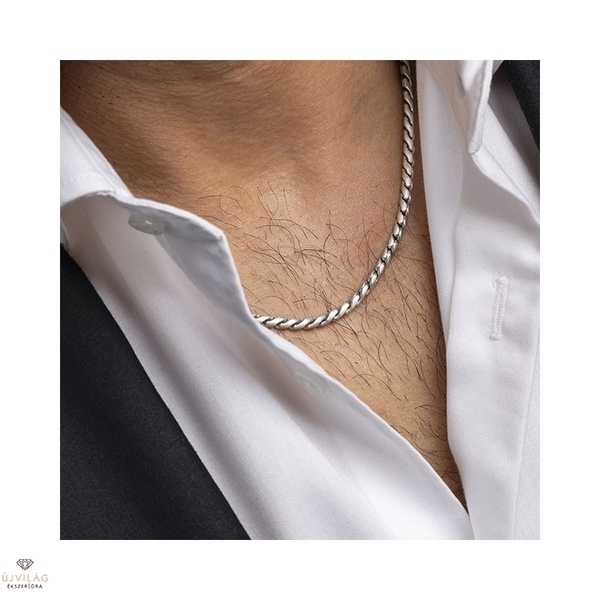 Klasszikus, férfias és divatos egyszerre – francia acél ékszerek minőségi kidolgozással. Ezüst színű acél nyaklánc letisztult, egymásba fonódó hengeres formájú csatszemekkel, karabiner zárral. A lánc hossza 55 cm, mely a hosszabbító révén kb. 50 cm-ig kisebb méretekre is állítható. A láncszemek szélessége 3 mm.