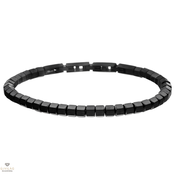STEELWEAR: Robusztus és kifejező – divatos férfi ékszerek Németországból - karkötők, nyakláncok, fülbevalók rozsdamentes acélból és/vagy bőrből. Fekete színű acél karkötő kocka-formájú csatszemekből, rápattintós zárral, a karkötő hossza: 21 cm, amelyből 2 darab 1 cm-es csatrész kivehető, így rövidebb méretre is állítható.