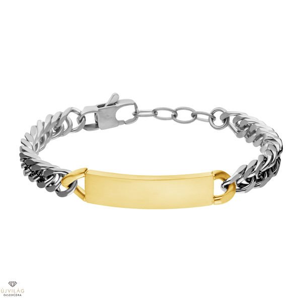 STEELWEAR: Robusztus és kifejező – divatos férfi ékszerek Németországból - karkötők, nyakláncok, fülbevalók rozsdamentes acélból és/vagy bőrből. Ezüst színű acél karkötő masszív láncszemekkel, karabiner zárral, a sárga arany színű kiegészítő elem gravírozásra is alkalmas, így egyedivé tehető! A karkötő hossza 21 cm, mely a hosszabbító révén kb. 19 cm-ig rövidebb méretekre is beállítható. A láncszemek szélessége 8 mm, a sárga arany színű elem mérete 10x38 mm, ennek sárga színe nagy kopásállóságú IP bevonat.