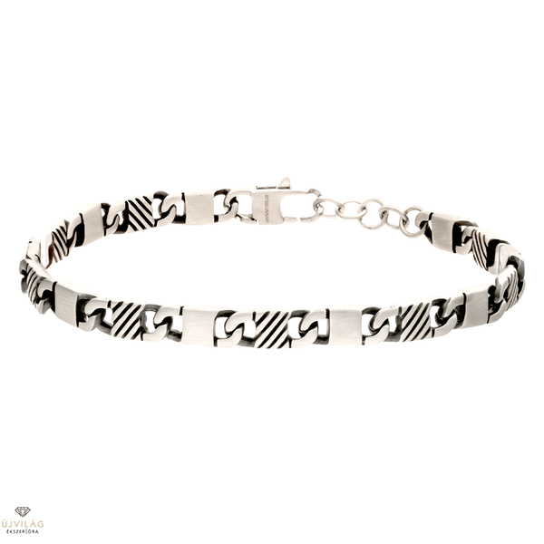 STEELWEAR: Robusztus és kifejező – divatos férfi ékszerek Németországból - karkötők, nyakláncok, fülbevalók rozsdamentes acélból és/vagy bőrből. Szürke színű acél karkötő átlósan bordázott csatszemekkel, karabiner zárral. A karkötő hossza 22 cm, amely a hosszabbító révén kb. 21 cm-ig rövidebb méretekre is beállítható. A láncszemek szélessége 6 mm.