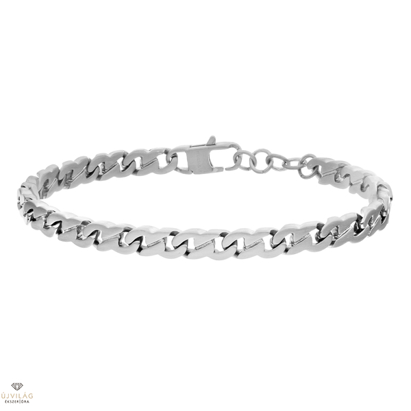 STEELWEAR: Robusztus és kifejező – divatos férfi ékszerek Németországból - karkötők, nyakláncok, fülbevalók rozsdamentes acélból és/vagy bőrből. Ezüst színű acél karkötő különleges formájú, masszív csatszemekkel, karabiner zárral. A karkötő hossza 22 cm, amely a hosszabbító révén kb. 21 cm-ig rövidebb méretekre is beállítható. A láncszemek szélessége 6 mm.