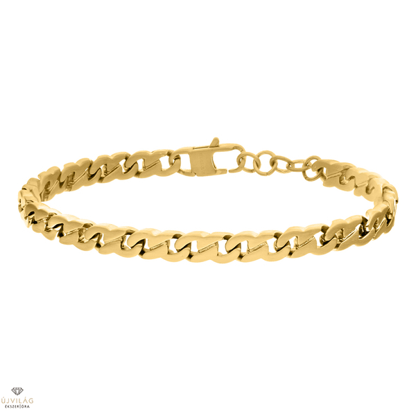 STEELWEAR: Robusztus és kifejező – divatos férfi ékszerek Németországból - karkötők, nyakláncok, fülbevalók rozsdamentes acélból és/vagy bőrből. Sárga arany színű acél karkötő különleges formájú, masszív csatszemekkel, karabiner zárral. A karkötő hossza 22 cm, amely a hosszabbító révén kb. 21 cm-ig rövidebb méretekre is beállítható. A láncszemek szélessége 6 mm. A karkötő sárga arany színe nagy kopásállóságú IP bevonat.