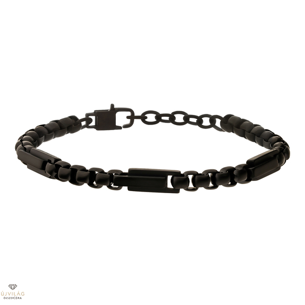 STEELWEAR: Robusztus és kifejező – divatos férfi ékszerek Németországból - karkötők, nyakláncok, fülbevalók rozsdamentes acélból és/vagy bőrből. Fekete színű acél karkötő látványos kiegészítő elemekkel, karabiner zárral. A karkötő hossza 23 cm, amely a hosszabbító révén kb. 20 cm-ig rövidebb méretekre is beállítható. A láncszemek szélessége 5 mm. A karkötő fekete színe nagy kopásállóságú IP bevonat.