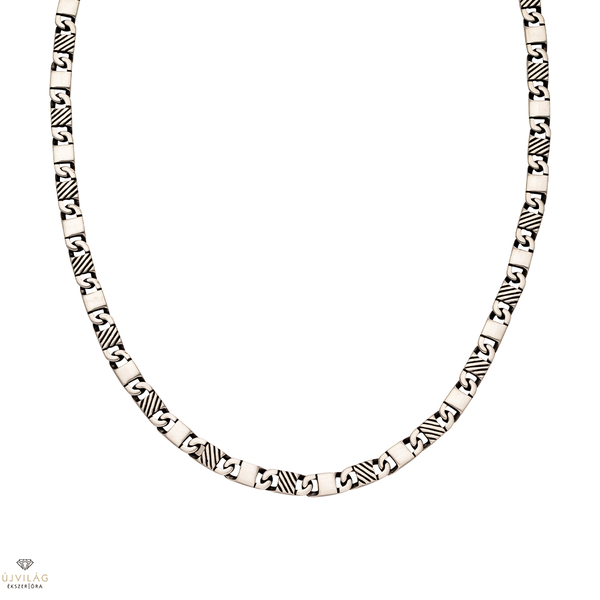 STEELWEAR: Robusztus és kifejező – divatos férfi ékszerek Németországból - karkötők, nyakláncok, fülbevalók rozsdamentes acélból és/vagy bőrből. Szürke színű acél nyaklánc átlósan bordázott csatszemekkel, karabiner zárral. A lánc hossza 60 cm, amely a hosszabbító révén kb. 57 cm-ig rövidebb méretekre is beállítható. A láncszemek szélessége 6 mm.