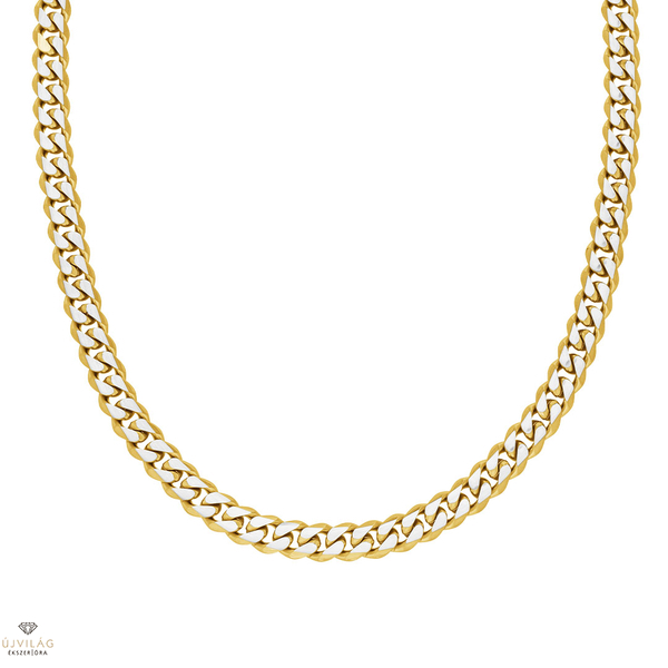 STEELWEAR: Robusztus és kifejező – divatos férfi ékszerek Németországból - karkötők, nyakláncok, fülbevalók rozsdamentes acélból és/vagy bőrből. Sárga arany és ezüst színű acél nyaklánc szögletesre csiszolt csatszemekkel, karabiner zárral, a lánc hossza: 55 cm, mely a hosszabbító révén 50 cm-ig rövidebb méretekre is állítható. A láncszemek szélessége 6 mm. A nyaklánc szélén a sárga szín nagy kopásállóságú IP bevonat.
