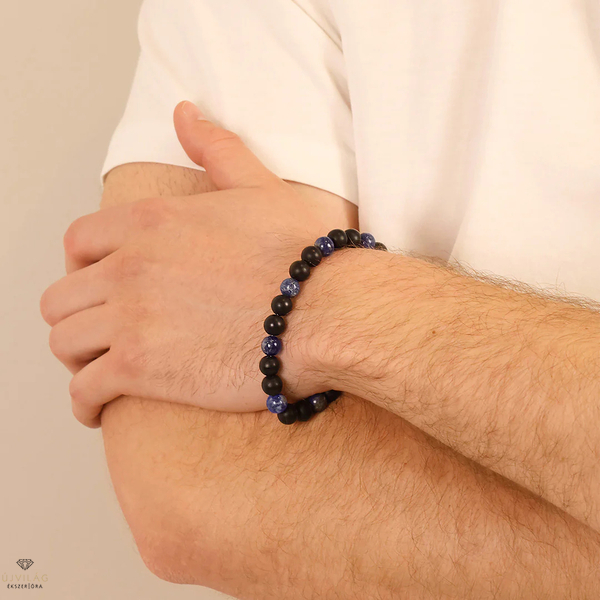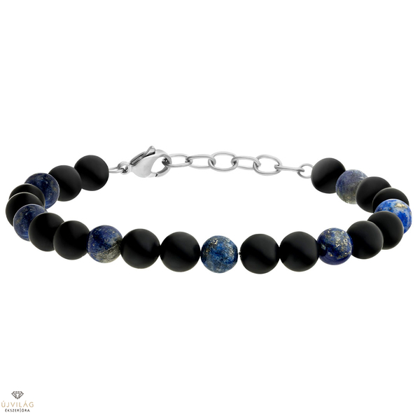 STEELWEAR: Robusztus és kifejező – divatos férfi ékszerek Németországból - karkötők, nyakláncok, fülbevalók rozsdamentes acélból és/vagy bőrből. Ásványi kőzet karkötő 8 mm-es fekete achát és kék színű lazurit ásvány gömbökkel karabiner zárral. A karkötő hossza: 22 cm, amely a hosszabbító révén 19 cm-ig rövidebb méretekre is állítható.