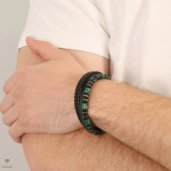 STEELWEAR: Robusztus és kifejező – divatos férfi ékszerek Németországból - karkötők, nyakláncok, fülbevalók rozsdamentes acélból és/vagy bőrből. Fekete és zöld színű többszálú fonott bőr, hasított bőr karkötő zöld színű malachit, szürkés hematit és ezüstös ónix ásványi szemekkel mágneses zárral, a karkötő hossza: 21,5 cm, amelyből egy darab 0,8 cm-es zár-rész kivehető, ezzel a karkötő mérete csökkenthető.