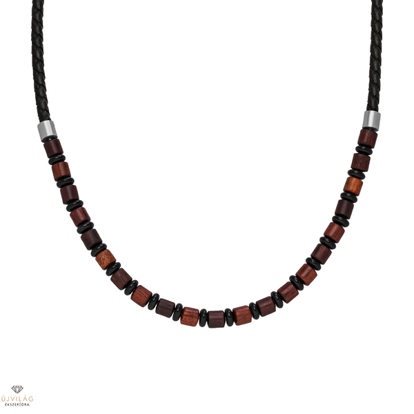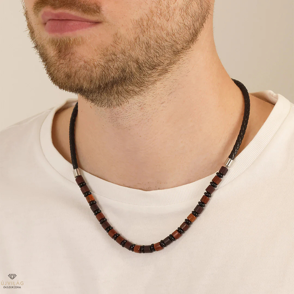 STEELWEAR: Robusztus és kifejező – divatos férfi ékszerek Németországból - karkötők, nyakláncok, fülbevalók rozsdamentes acélból és/vagy bőrből. Barna színű, hengeres formájú fonott bőr nyaklánc barnás bordó árnyalatú fából készült szemekkel és ónix ásvánnyal, nyomógombos zárral. A nyaklánc hossza: 50 cm (egy méret - nem állítható!), a bőrszál átmérője 4 mm, a fa és az ónix szemek szélessége 6 és 5 mm.