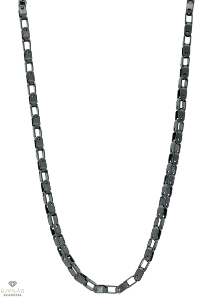 STEELWEAR: Robusztus és kifejező – divatos férfi ékszerek Németországból - karkötők, nyakláncok, fülbevalók rozsdamentes acélból és/vagy bőrből. Fekete színű acél nyaklánc géplánc formájú láncszemekkel, karabiner zárral, a lánc hossza: 55 cm, amely a hosszabbító révén rövidebb méretre is állítható. A láncszemek szélessége 2 mm.
