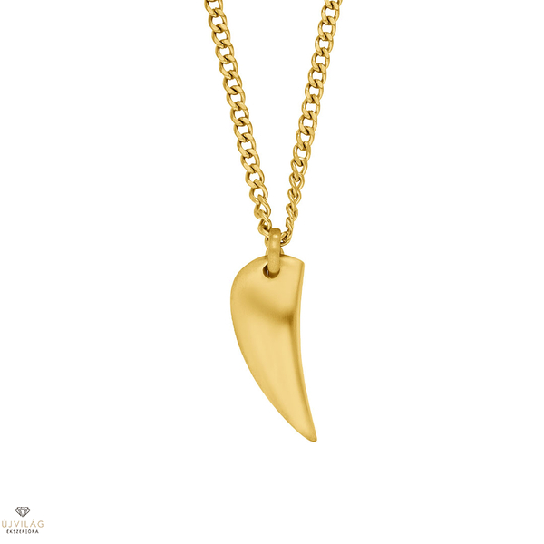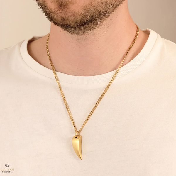 STEELWEAR: Robusztus és kifejező – divatos férfi ékszerek Németországból - karkötők, nyakláncok, fülbevalók rozsdamentes acélból és/vagy bőrből. Sárga arany színű acél nyaklánc agyar-formájú medállal, karabiner zárral. A medál hossza 35 mm, vastagsága 6 mm, legszélesebb részén 13 mm széles. A lánc hossza 55 cm, mely a hosszabbító révén 50 cm-ig rövidebb méretekre is állítható. A lánc-szemek szélessége 4 mm. A nyaklánc sárga színe nagy kopásállóságú IP bevonat.