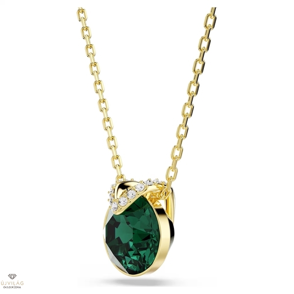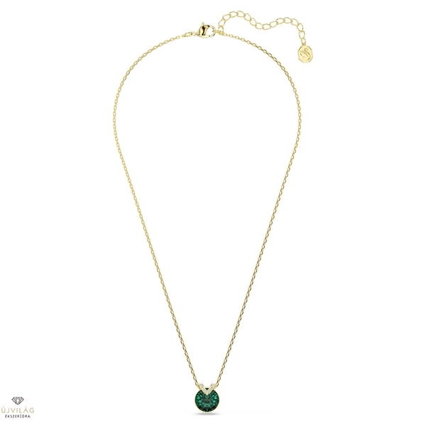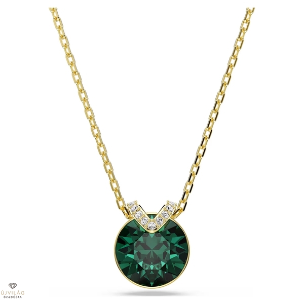 Ez az igéző V alakú medál figyelemfelkeltő, köszönhetően az aranyszínű bevonatba foglalt központi zöld kristálynak. A csillogó pavé további gyönyörű réteggel gazdagítja az ékszert, a finom lánc pedig színtiszta eleganciát sugall. Viselje a hozzá illő fülbevalóval együtt a csodálatos kombinációért. Méretek: Hossz (minimum - maximum): 38 - 43 cm. Minta mérete: 1.3 x 1.1 cm
