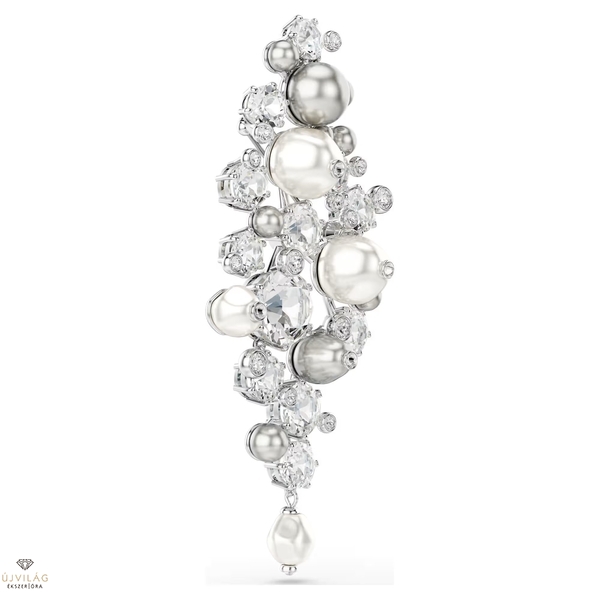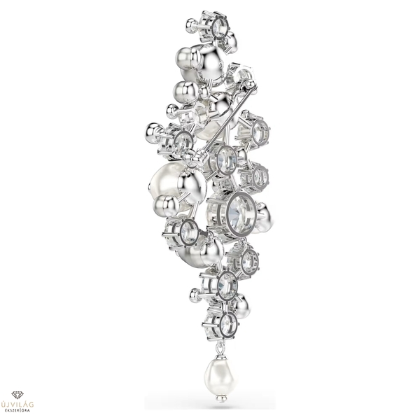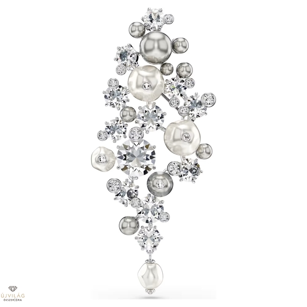 Tapasztalja meg stílusa kozmikus oldalát ezzel a csillag alakú, ródiumbevonatú brossal. A drámai sziluett átlátszó kristályok, valamint fehér és szürke Swarovski kristálygyöngyök csoportját fedi fel, amelyek aprólékosan kidolgozott, összetett, mégis harmonikus stílusban egyesülnek. Viselje ezt a brosst a hozzáillő fülbevalókkal vagy rövid nyakékkel a mennyei hatás maximalizálása érdekében. Méret: 8.8 x 1.8 cm.