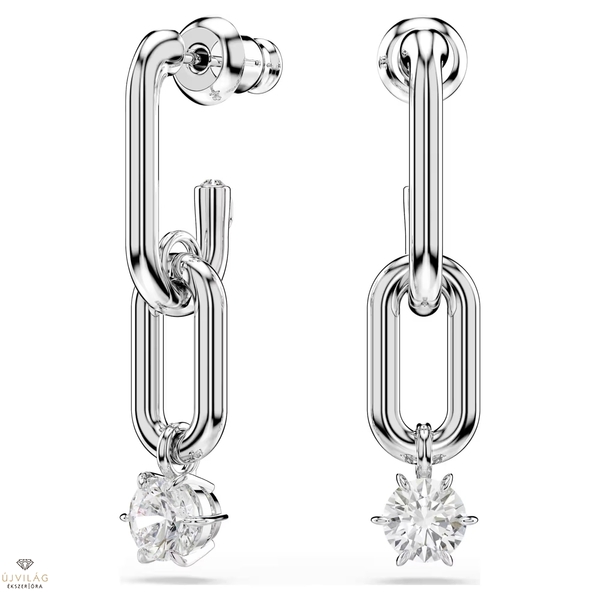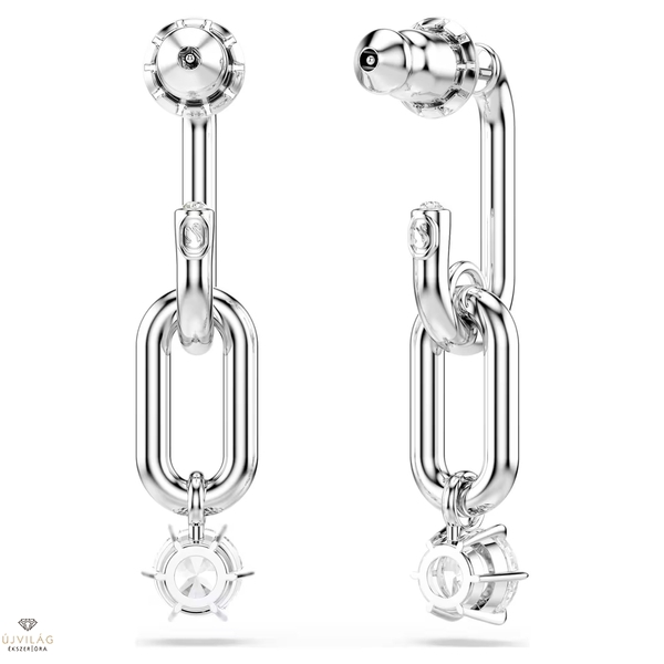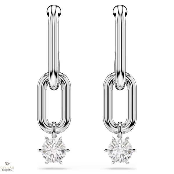 E játékos fülbevaló tökéletes választást jelent a váratlan stíluskombinációkhoz. Mindegyik darab két összekapcsolódó, ródiumbevonatú láncszemből áll, amelyek alól kecsesen lóg egy prong foglalatú Swarovski Zirconia kristály. Ez a letisztult, fémes megjelenésű ékszer minden alkalomra tökéletes, és extra Swarovski-ragyogást kölcsönöz viselőjének. Méretek: 3.2 x 0.7 cm