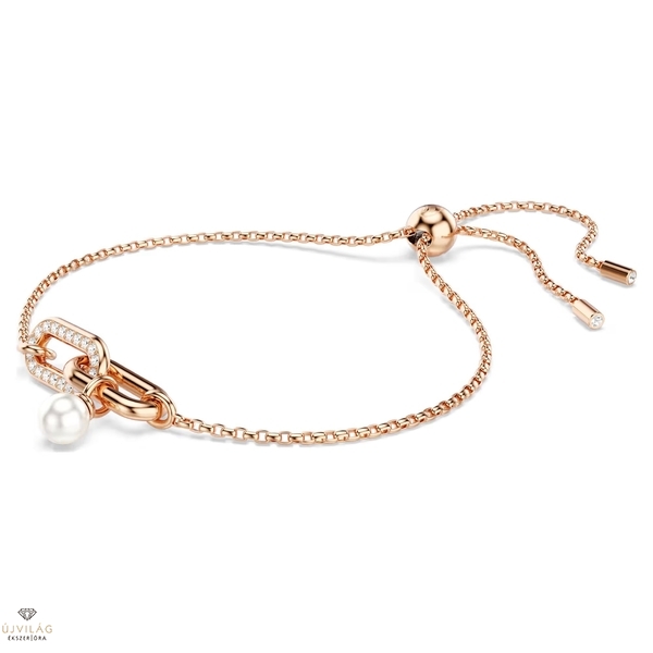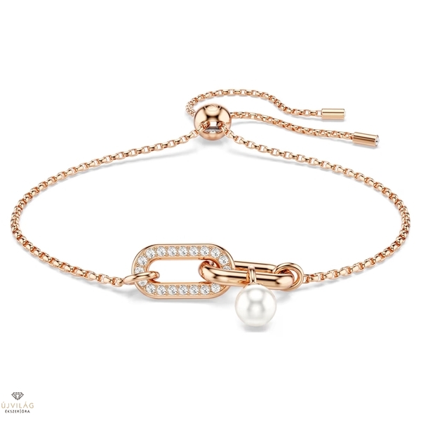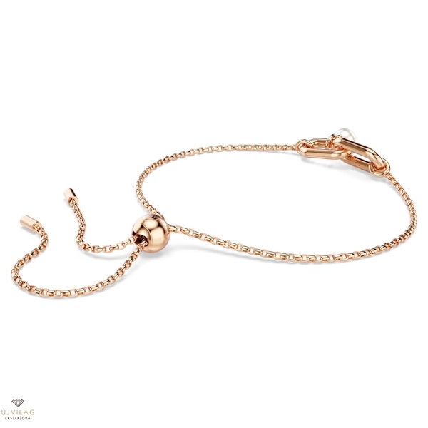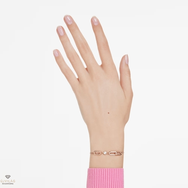 A letisztult elegancia jegyében készült Constella karkötő rózsaarany-tónusú bevonattal rendelkezik, és két összekapcsolódó láncszem díszíti, amelyek közül az egyiket átlátszó pavé borítja. Alatta egyetlen Swarovski kristálygyöngy függ kecsesen, a csúsztatható zár pedig a méret beállítását teszi lehetővé. A harmonikus megjelenés érdekében párosítsa ezt a karkötőt a hozzáillő fülbevalókkal vagy az ékszercsalád egy medáljával. Méretek: Maximális hossz: 24 cm. Minta mérete: 0.7 x 2.1 cm