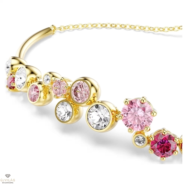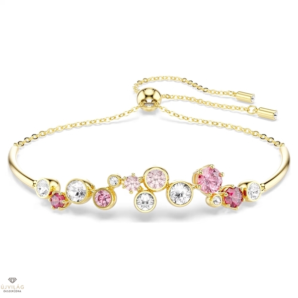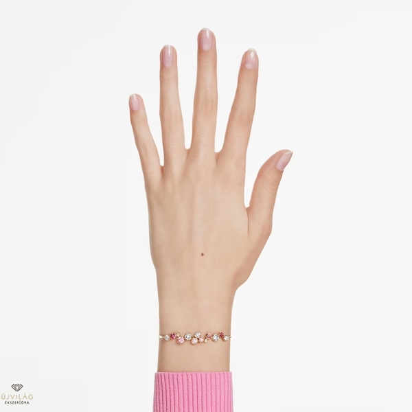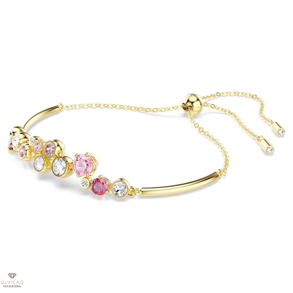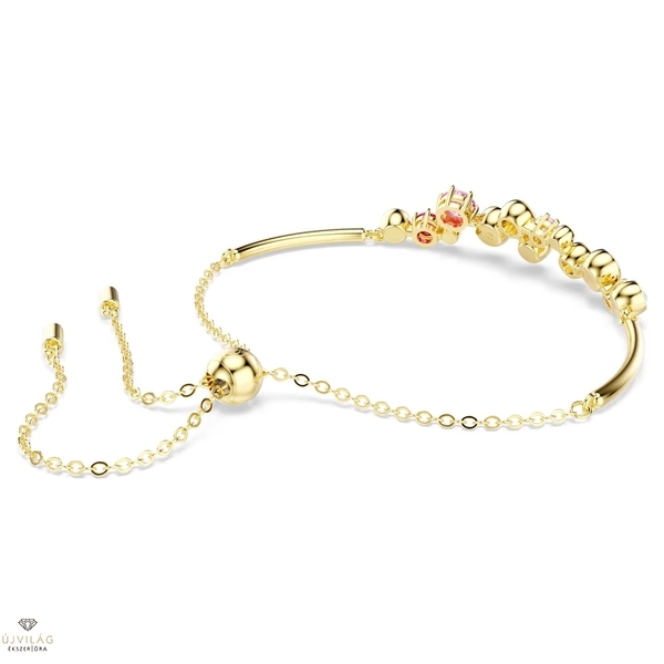 Engedje szabadjára játékos oldalát ezzel a meleg és vidám karkötővel. A Constella formavilág finom láncot és aranyszínű bevonattal ellátott rudakat tartalmaz, valamint különböző méretű élénk kristályokat és Swarovski Zirconia kristályokat. Az átlátszó, rózsaszín és piros árnyalatok élénk keveréke magával ragadó megjelenést kölcsönöz a karkötőnek, a csúsztatható állítási lehetőség pedig lehetővé teszi az illeszkedés egyszerű módosítását. Méretek: Maximális hossz: 24 cm. Minta mérete: 0.9 x 5 cm