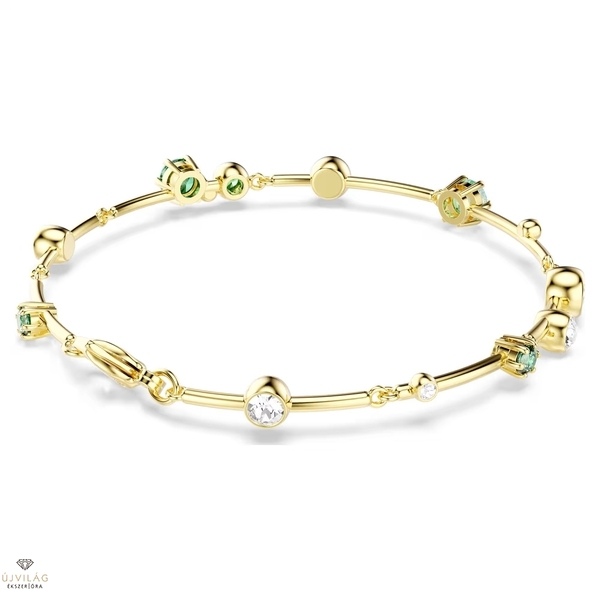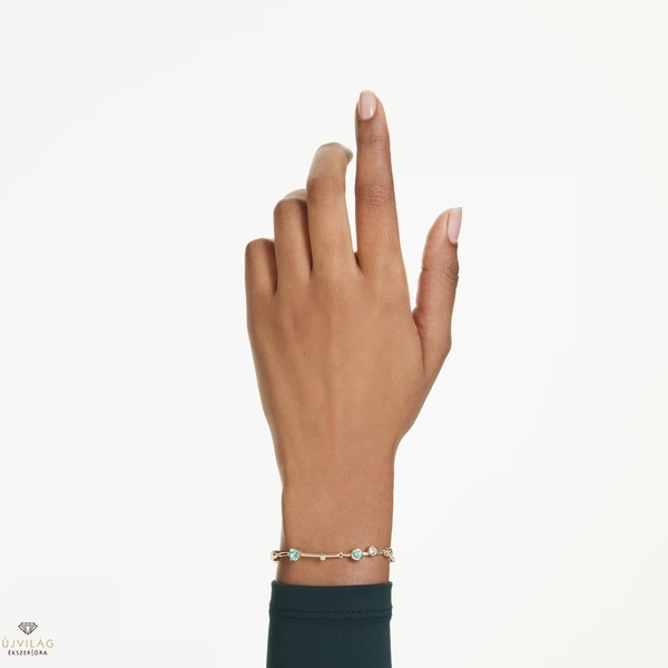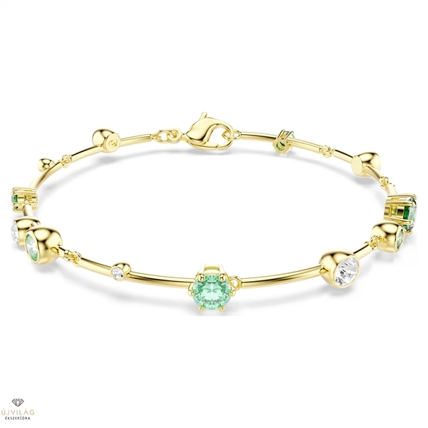 Ez az élénk Constella karkötő ragyogással öleli körül a csuklót. Az aranytónusú bevonattal ellátott karkötő tagolt szemeit különböző méretű kristályok és Swarovski Zirconia kristályok díszítik. Az átlátszó és zöld árnyalatok élénk keveréke prong és bezel foglalatban pompázik. A delfin zár mellett a karkötő egy plusz hosszabbítóval is rendelkezik a sokoldalú viselési lehetőségek érdekében. Méretek: Hossz (minimum - maximum): 17 - 20 cm. Szélesség: 0.6 cm