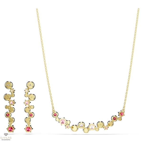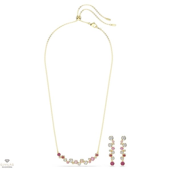 Ez az aranyszínű bevonattal ellátott Constella szett a vidám színek jegyében készült. A nyakláncból és egy pár fülbevalóból álló szett minden darabját átlátszó kristályok, valamint különböző méretű és árnyalatú rózsaszín és piros Swarovski Zirconia kristályok díszítik prong vagy bezel foglalatban. A nyaklánc csúsztatható hosszbeállítóval rendelkezik a sokoldalú illeszkedés érdekében. Meleg és élénk szett, amely feldob minden öltözéket. Nyaklánc hossza: 38 - 48 cm. Minta mérete: 0.8 x 5.2 cm. Fülbevalók: 3.8 x 0.9 cm.