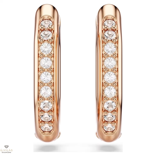 Fejezze ki egyéniségét ezzel a geometrikus karika fülbevalóval. A karcsú, nyolcszögletű kialakítás merész keretet ad a kerek kristályok sorának, amelyek mindegyikét finom prong foglalat díszíti. A különleges rugós lapos szerkezetnek köszönhetően a fülbevaló könnyen nyitható és zárható, a rózsaarany tónusú bevonat pedig tökéletes más Dextera darabokkal való viselésre. Méret: 1.8 x 0.3 x 1.5 cm.