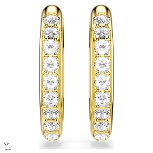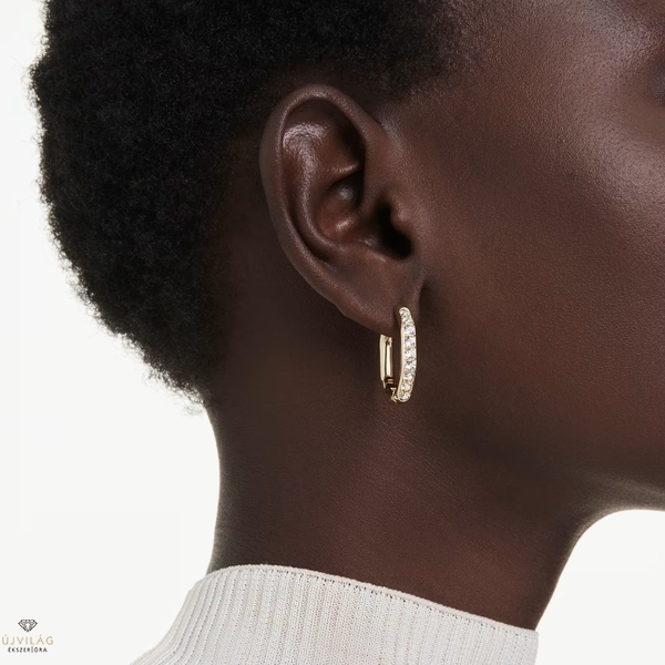 Fejezze ki egyéniségét ezzel a geometrikus karika fülbevalóval. A karcsú, nyolcszögletű kialakítás merész keretet ad a kerek, átlátszó kristályok sorának, amelyek mindegyikét finom prong foglalat díszíti. A különleges rugós lapos szerkezetnek köszönhetően a fülbevaló könnyen nyitható és zárható, az aranyszínű bevonat pedig tökéletes más Dextera darabokkal való viselésre. Méretek: 2.4 x 0.4 x 2 cm