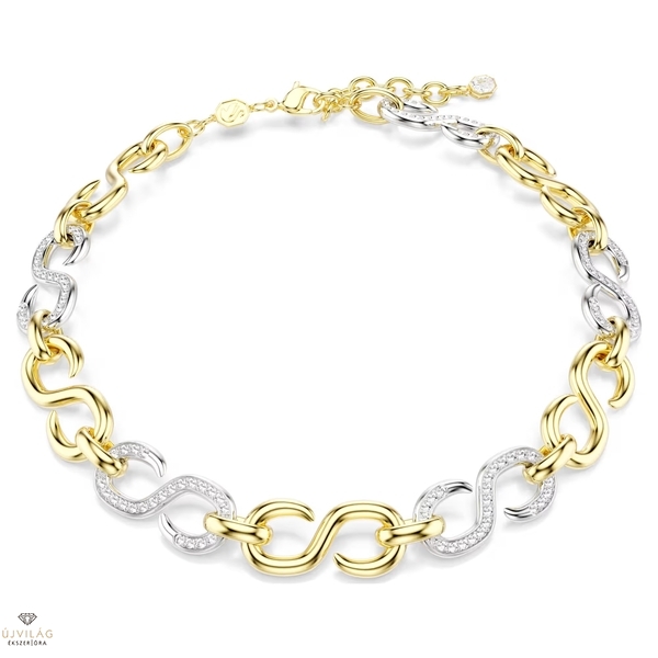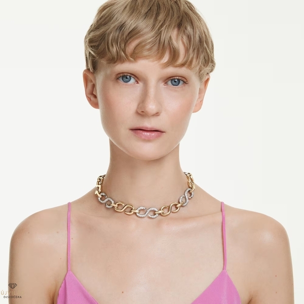 A choker nyakláncként vagy nyakékként viselhető Dextera ékszer könnyedén a stílusához igazítható. A darab arany tónusú és ródiumbevonatú láncszemekből áll, amelyeket átlátszó kristályok díszítenek a maximális ragyogás érdekében. Ívelt, ipari megjelenésével más, hozzáillő Dextera darabokkal is párosítható, amelyek ugyanezzel a jellegzetes formavilággal rendelkeznek. Méretek: Hossz (minimum - maximum): 34 - 39.3 cm. Szélesség: 1.5 cm Méret: 34-39,3 cm