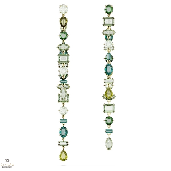 A természet ihlette felvillanyzó smaragd árnyalat teszi élénkké a csepp alakú fülbevalót. A fülbevalók két aszimmetrikus szálból állnak, melyeken vegyes metszésű kövek sokasága található a zöld megannyi árnyalatában, aranyszínű bevonatos foglalaton. Csodálatosan bohém ajándék egy szerettének - vagy önmagának. Méret: 9.8 x 0.9 cm