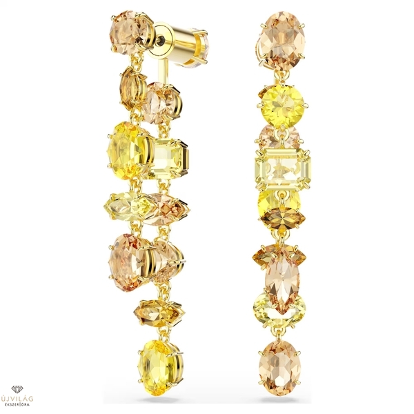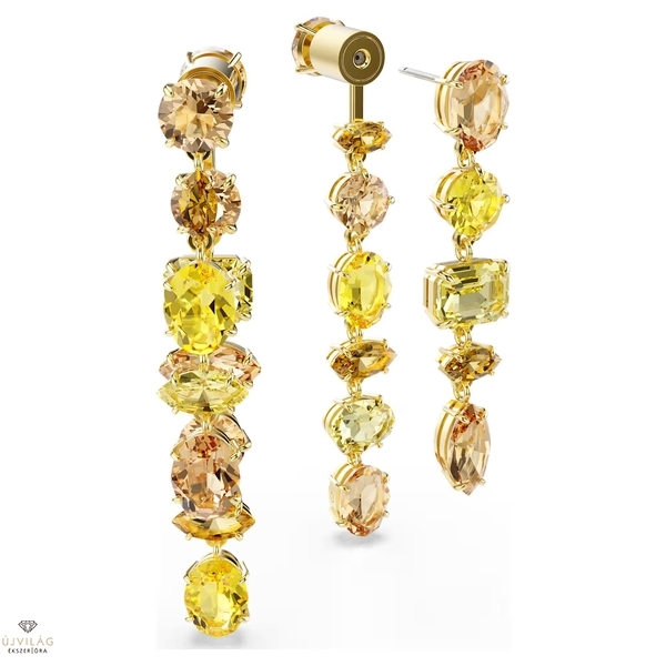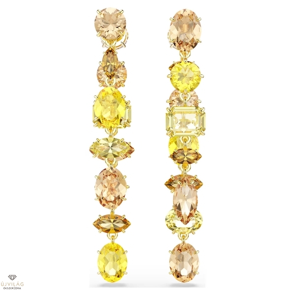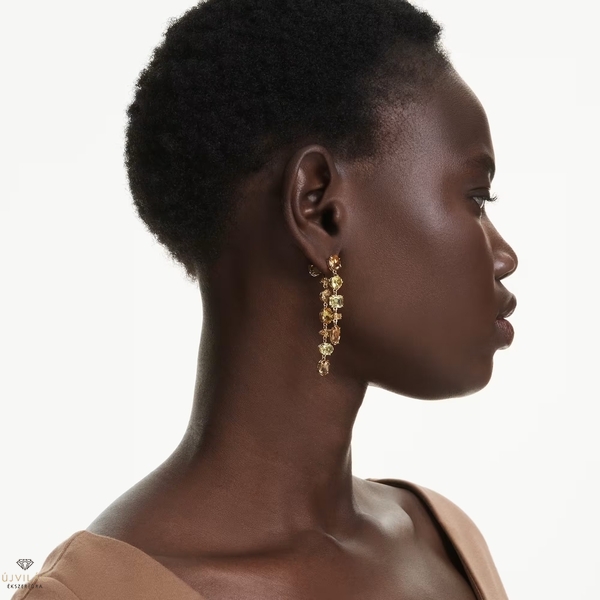 Ezek a kifejező bedugós fülbevalók a hangulatjavító energia jegyében készültek. A két aszimmetrikus strandot tartalmazó, aranyszínű bevonattal ellátott fülbevaló mindegyikét különböző metszésű, sárga és borostyánszínű kristályok prong foglalatos kombinációja díszíti. A Gema váratlan formációit és élénk szépségét testesítik meg, és még ragyogóbbá válnak, ha az ékszercsaládba tartozó, hozzáillő ékszerekkel viseli. Méret: 5.8 x 0.9 cm