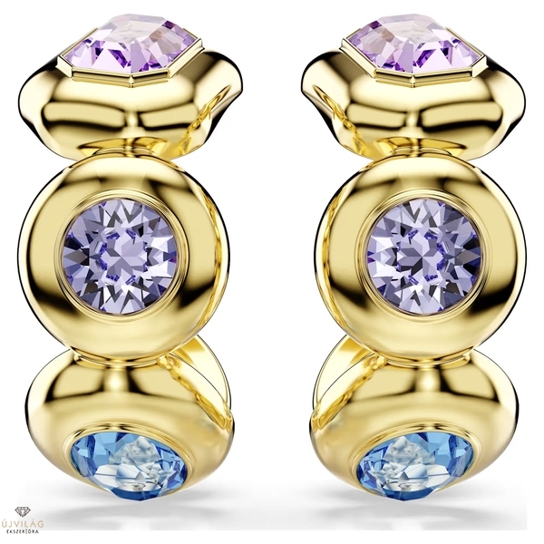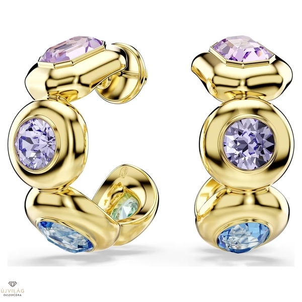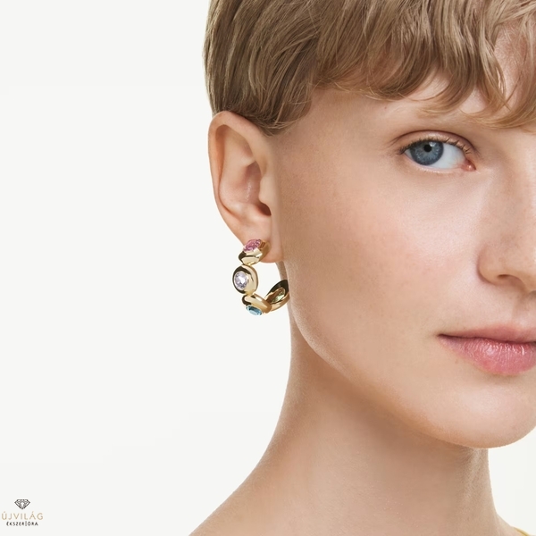 Fedezze fel a Gema értelmezését a klasszikus karika fülbevalókra. A színes és formabontó, arany tónusú bevonattal ellátott darabot négy nagy méretű kristály díszíti merész bezel foglalatban. A különféle metszések és árnyalatok között találunk Ice Blue színű Swarovski Recreated™ kristályokat is, amelyek tökéletesen illeszkednek a rózsaszín, lila és zöld árnyalataihoz. Méret: 3.1 x 1.3 x 2.9 cm.