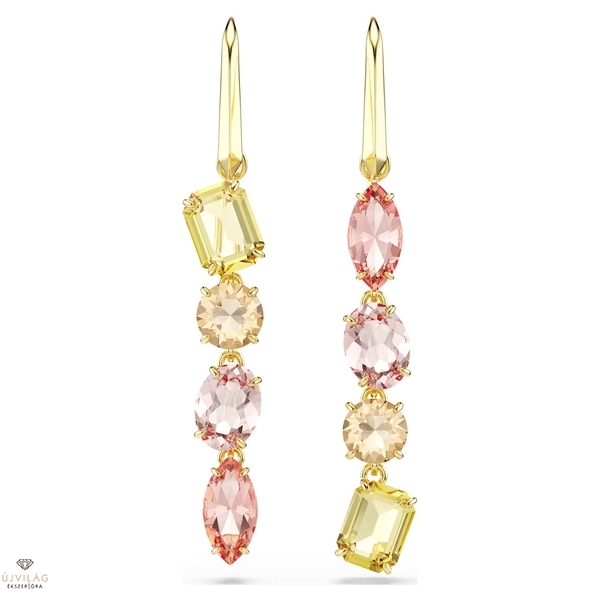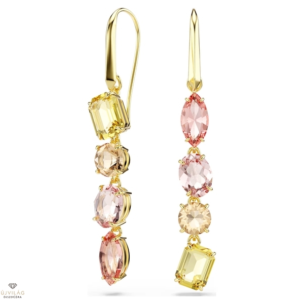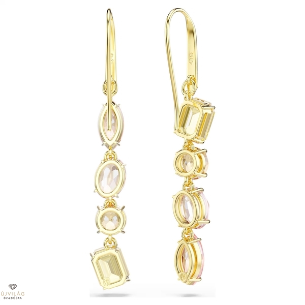 A váratlan formák a Gema termékcsalád jellegzetes stílusjegyei. Ebben a zuhatagszerű fülbevalóban ezt a szellemiséget gyönyörűen kelti életre a két, különböző formájú színes kristályokból álló láncolat. Az aszimmetrikus fülbevaló a sárga és rózsaszín különféle árnyalatait vonultatja fel, mindezt arany tónusú bevonattal ellátott foglalatban, meleg és ragyogó megjelenést kölcsönözve viselőjének. Méret: 5.7 x 0.8 cm.