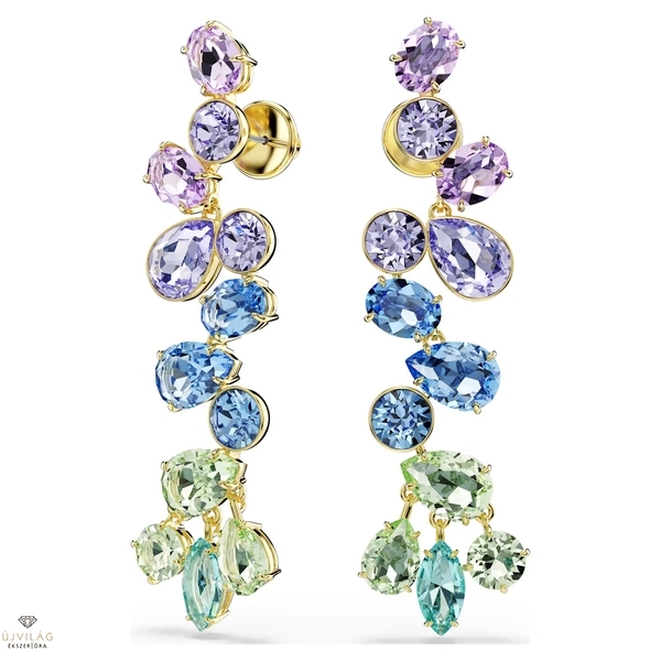 Egyetlen luxust sugárzó ruhatárból sem hiányozhat egy drámai kandeláber jellegű fülbevaló. Ez a feltűnő, zuhatag stílusú darab különféle árnyalatú lila, zöld és kék kristályokkal van díszítve, arany tónusú bevonattal ellátott foglalatban. Az artikulációk miatt a kristályok folyamatosan mozgásban vannak, ami állandó, élénk fényjátékot biztosít. Méret: 6.7 x 1.6 cm